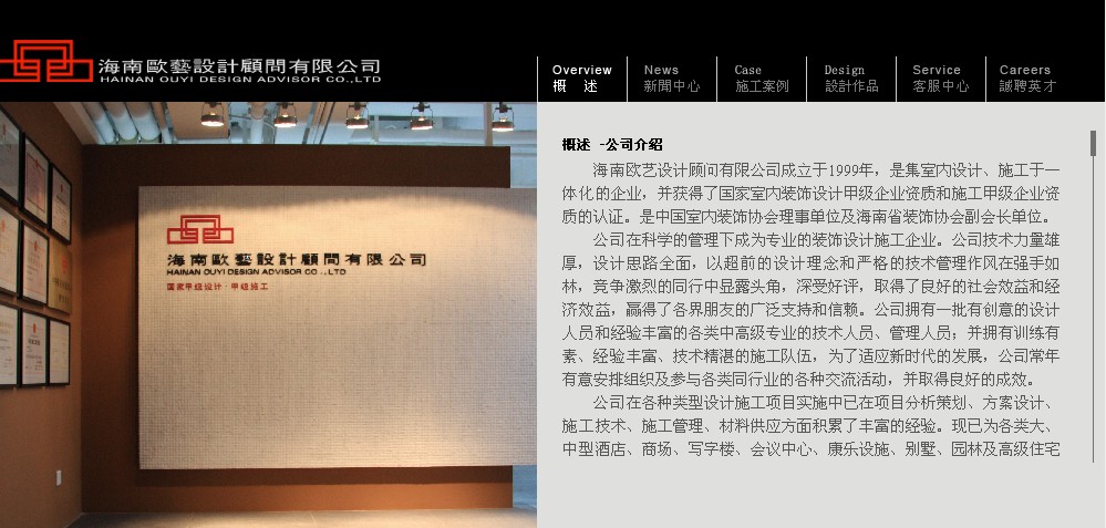 海南歐藝設(shè)計(jì)顧問(wèn)有限公司成立于1999年,是集室內(nèi)設(shè)計(jì)、施工于一體化的企業(yè),并獲得了國(guó)家室內(nèi)裝飾設(shè)計(jì)甲級(jí)企業(yè),并獲得了國(guó)家室內(nèi)裝飾設(shè)計(jì)甲級(jí)企業(yè)資質(zhì)和施工甲級(jí)企業(yè)資質(zhì)的認(rèn)證。是中國(guó)室內(nèi)裝飾協(xié)會(huì)理事單位及海南省裝飾協(xié)會(huì)副會(huì)長(zhǎng)單位。